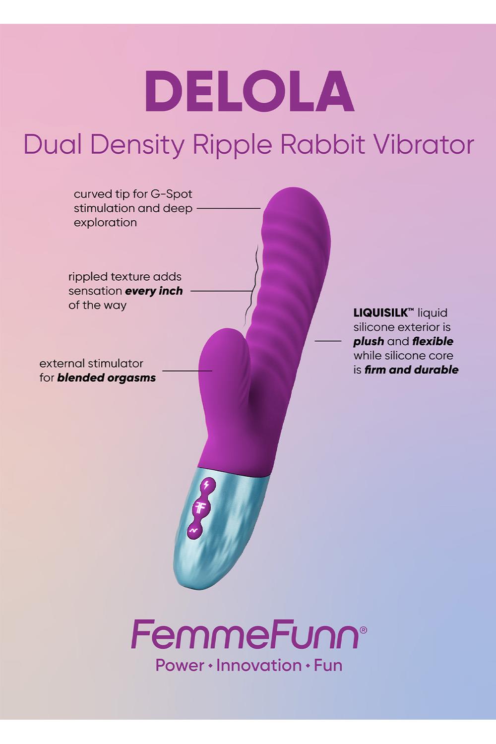 Experience all the feels. Delola sends waves of orgasmic sensation through your body with its firm core, cushy exterior, 8 vibration modes, rabbit tip, and curved rippled shaft. This ribbed dildo vibrator includes magnetic charging, making juicing back up a snap.