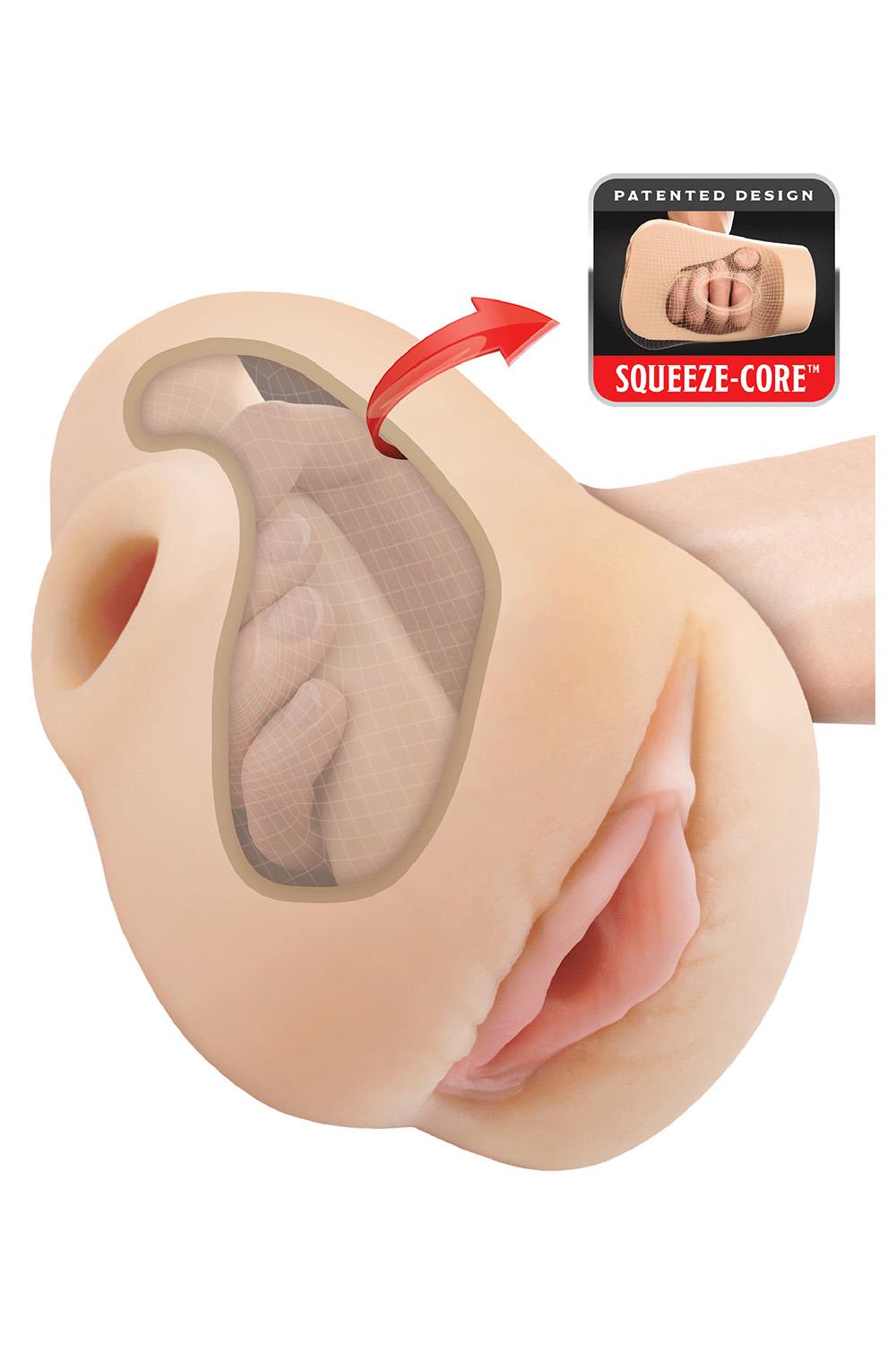 • SQUEEZE-CORE™ PATENTED DESIGN Our patented Squeeze-Core™ utility design features a hollow cavity built to fityour hands, and an interior pleasure tunnel that you can squeeze! This revolutionary feature allows you to fondle and squeeze your cock like never before!
