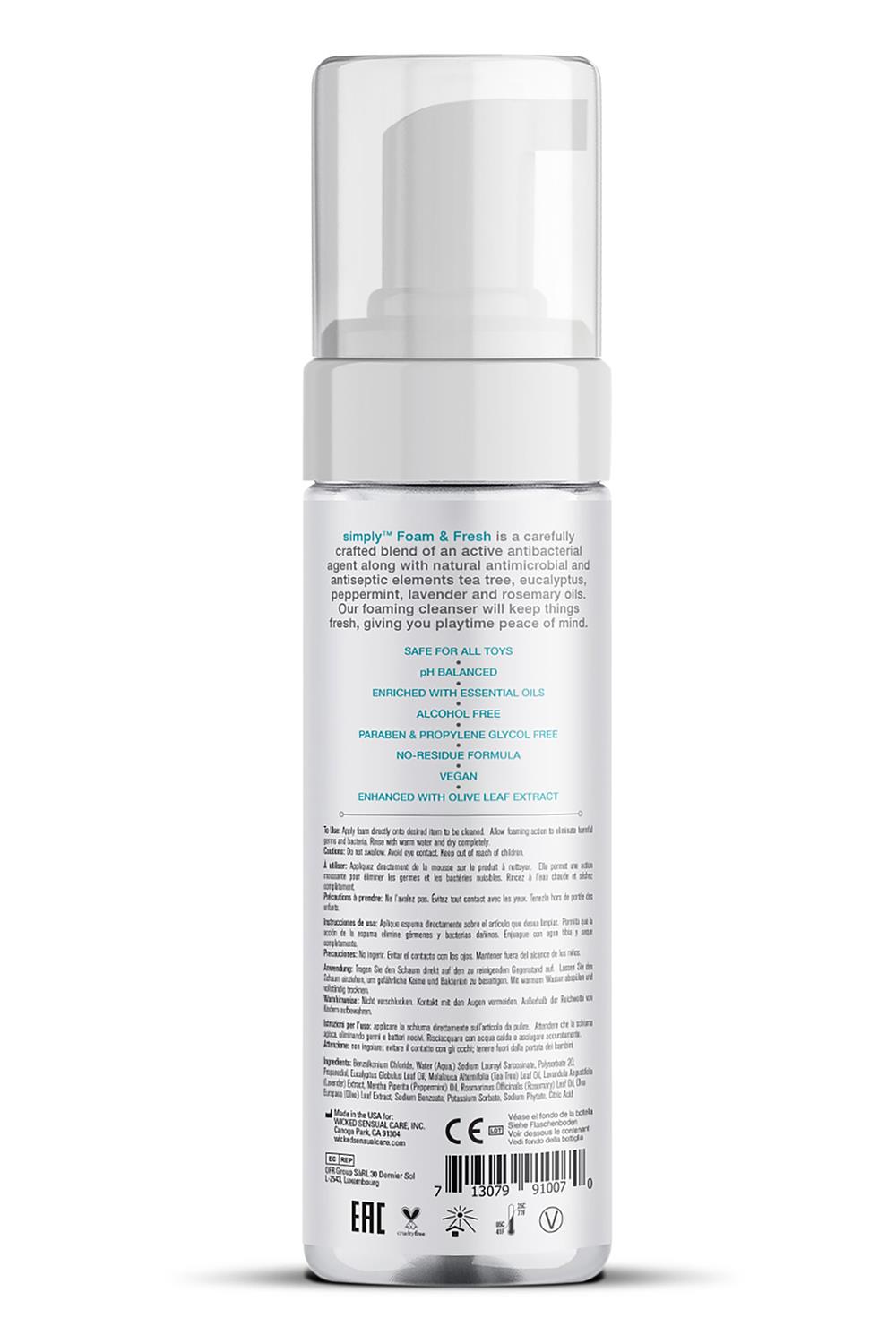 simply™ Foam and Fresh is a carefully crafted blend of an active antibacterial agent along with natural antimicrobial and antiseptic elements tea tree, eucalyptus, peppermint, lavender, and rosemary oils. Our foaming cleanser will keep things fresh, giving you playtime peace of mind.