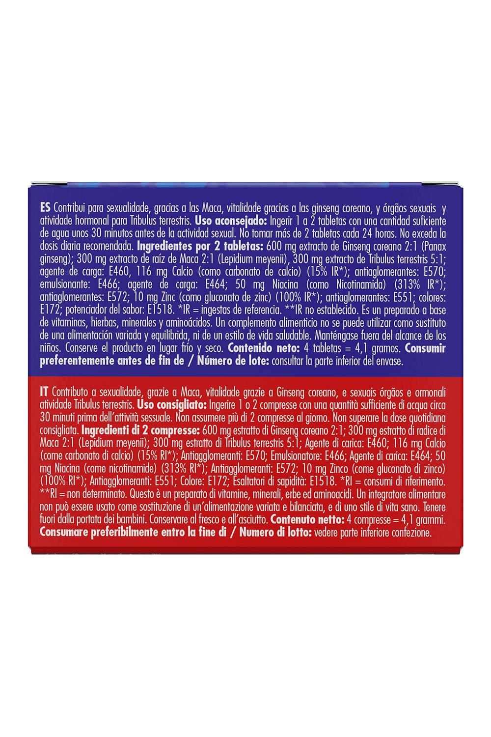 600 mg Korean ginseng extract (Panax ginseng); 300 mg Maca root extract 2:1 (Lepidium meyenii), 300 mg Tribulus terrestris extract 5:1; bulking agent: E460; 116 mg Calcium (as calcium carbonate) (15 % RI*); anti-caking agents: E570; Emulsifier: E466; bulking agent: E464; 50 mg Niacin (as Nicotinamide) (313 % RI*); anti-caking agents: E572; 10 mg Zinc (as Zinc gluconate) (100% RI*); ant-caking agent: E551; colour: E172; flavour enhancer: E1518. *RI = Reference intake.