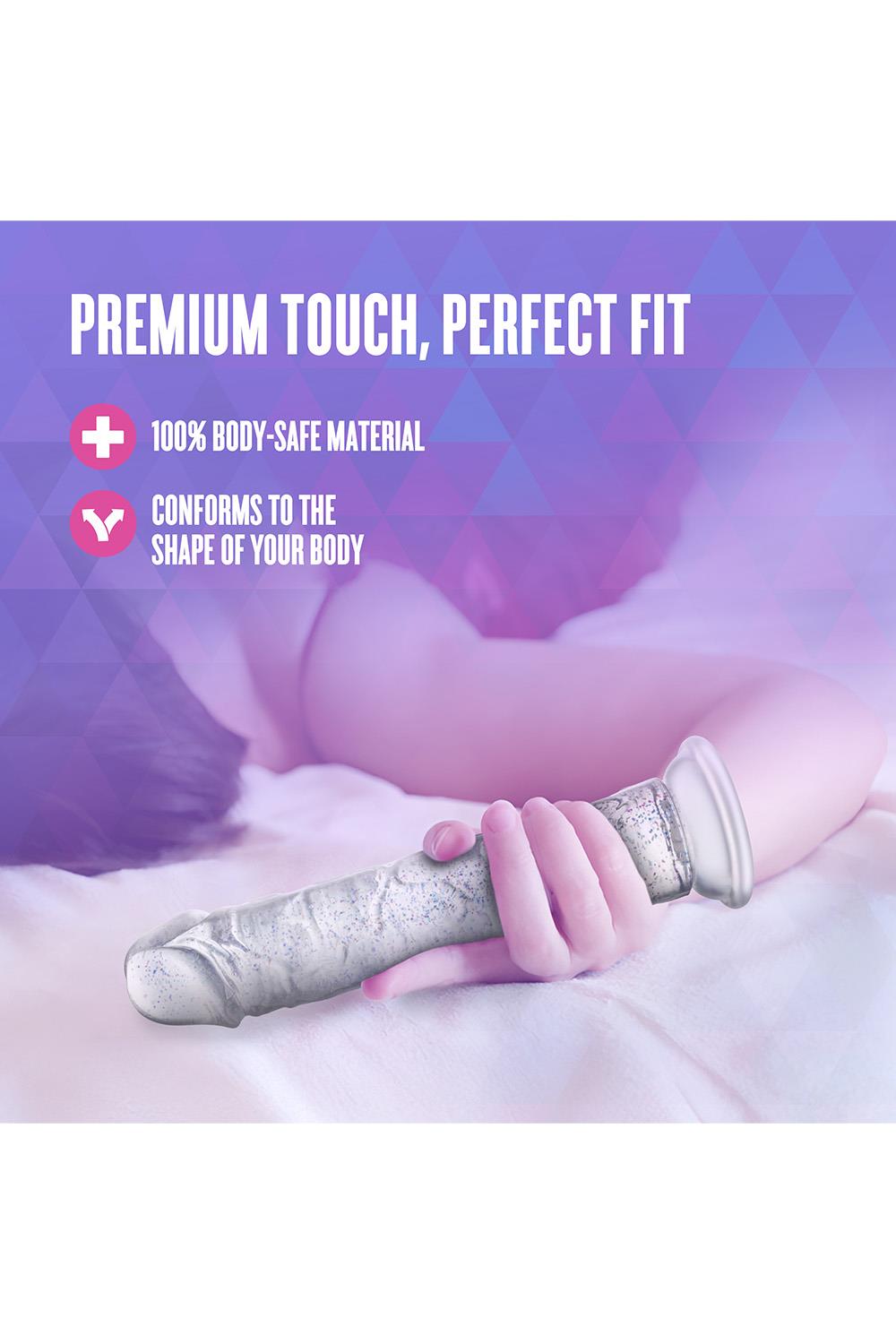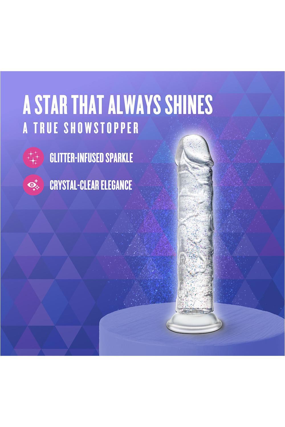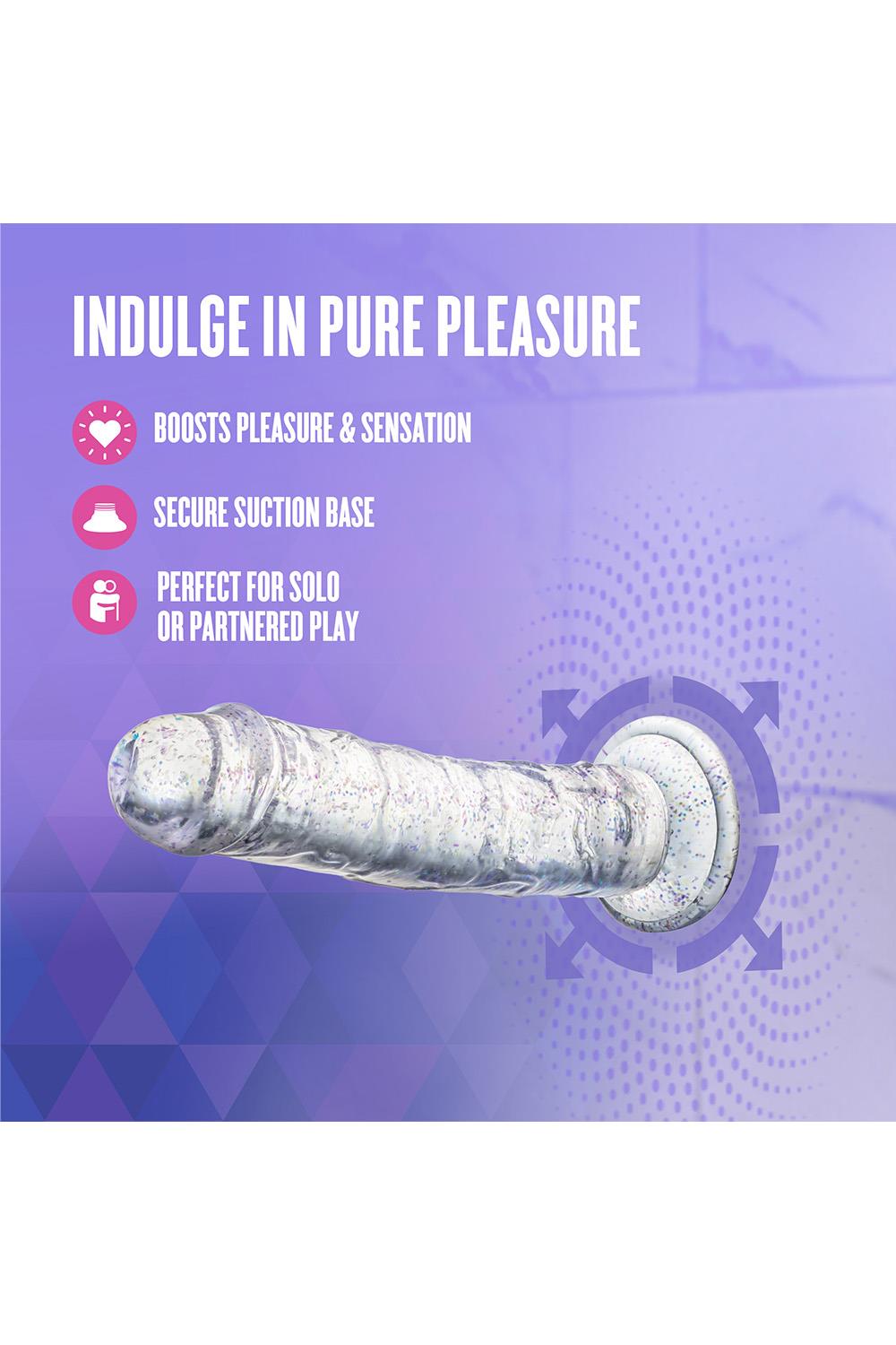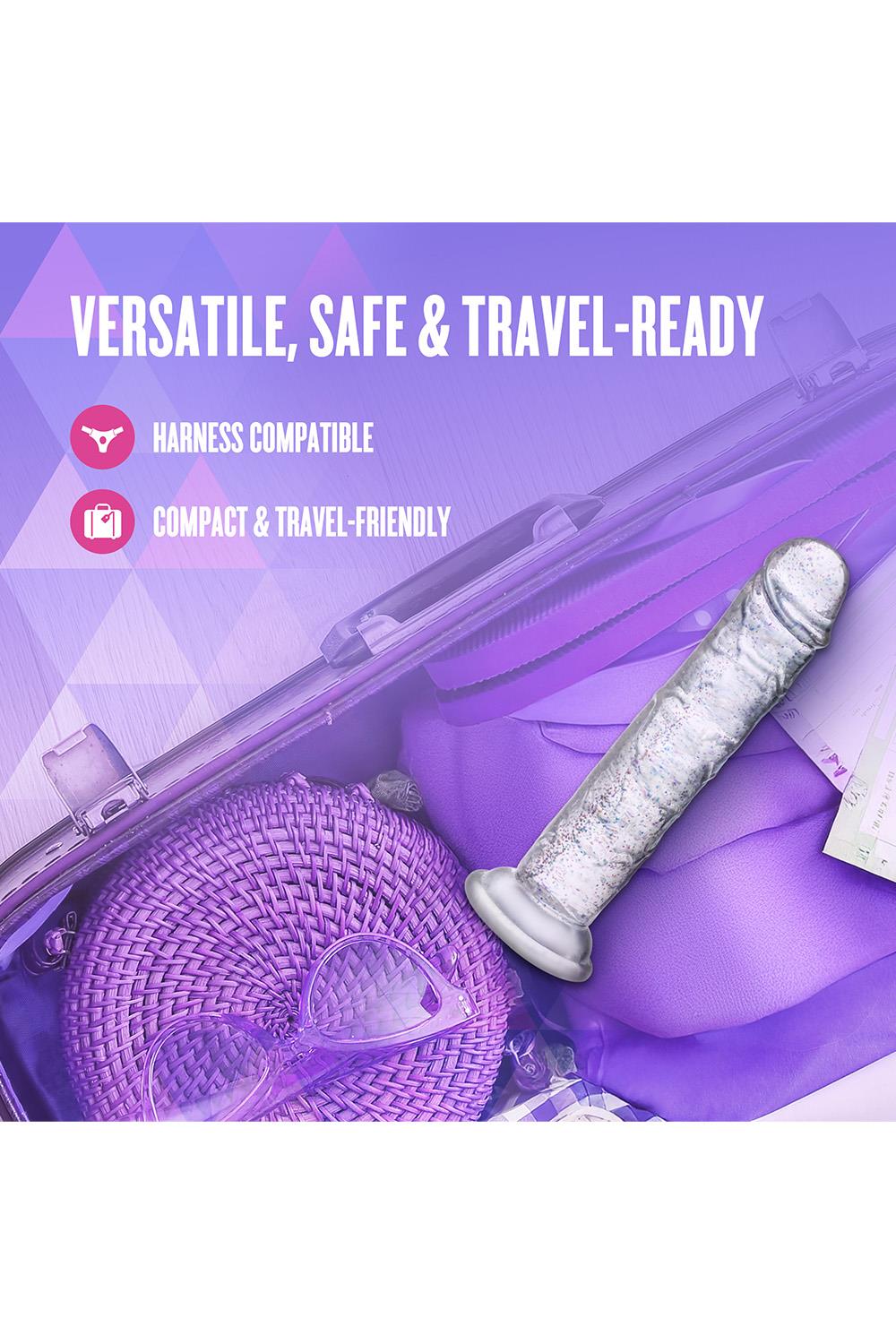 Step into the spotlight with Glamor, the glittering star of your pleasure collection. With its radiant color and subtle sparkle, Glamor adds a touch of glam to every intimate moment. Perfect for those who like their toys with a little extra flair. At 7 inches, it’s a versatile size that’s ideal for both solo exploration and partnered play. Designed to be flexible yet satisfyingly firm, Glamor adapts to your movements while offering a fulfilling experience. The strong suction cup base secures easily to smooth surfaces for hands-free fun and is fully harness compatible, giving you endless options for playful discovery. With its 100% body-safe design, Glamor is easy to clean and always ready for an encore. Whether you're indulging in a solo performance or sharing the stage with a partner, Glamor ensures every scene ends with a standing ovation.
