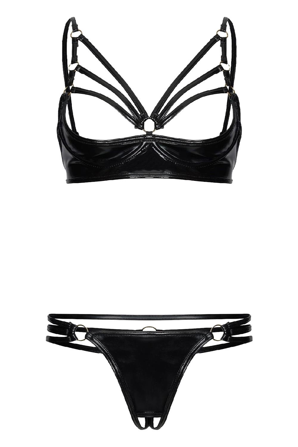 The strappy half-cup bra artfully frames the bust, offering visual intrigue and a supportive yet revealing fit. Paired with a matching open-crotch string, this set is crafted to contour the body, enhancing natural curves while leaving a lasting impression.