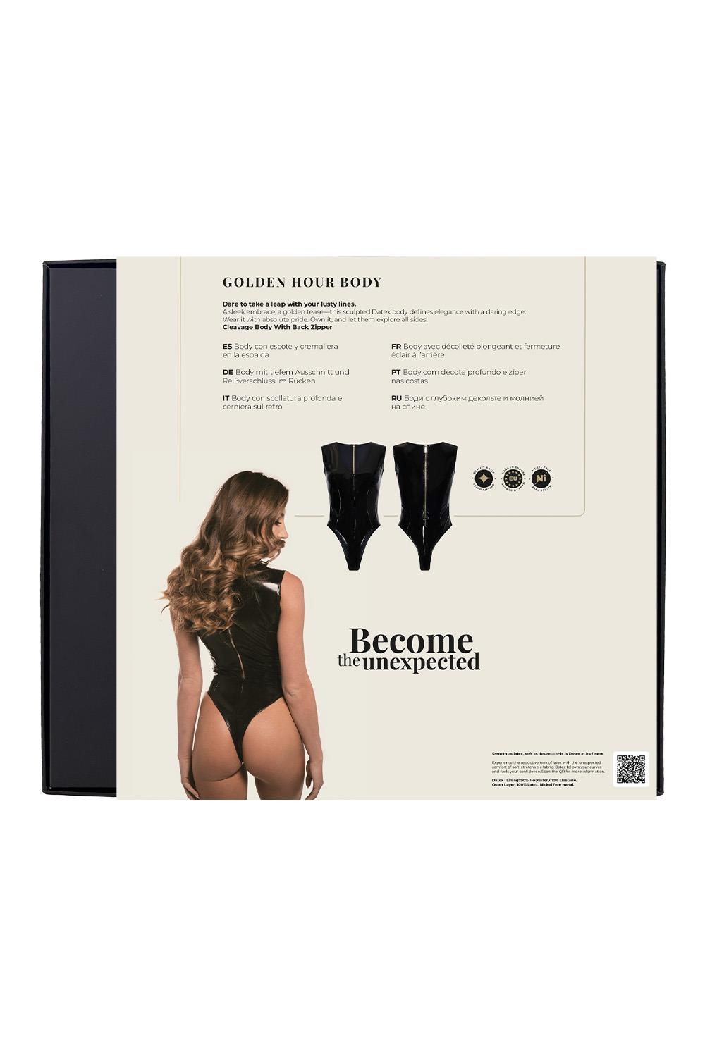 The gold-toned back zipper adds a sleek finishing touch — part closure, part statement — while the soft inner fabric ensures a comfortable fit that feels like a second skin. Whether worn as an eye-catching outfit centerpiece or as an intimate expression behind closed doors, the Golden Hour Body is made to be seen, remembered, and desired.